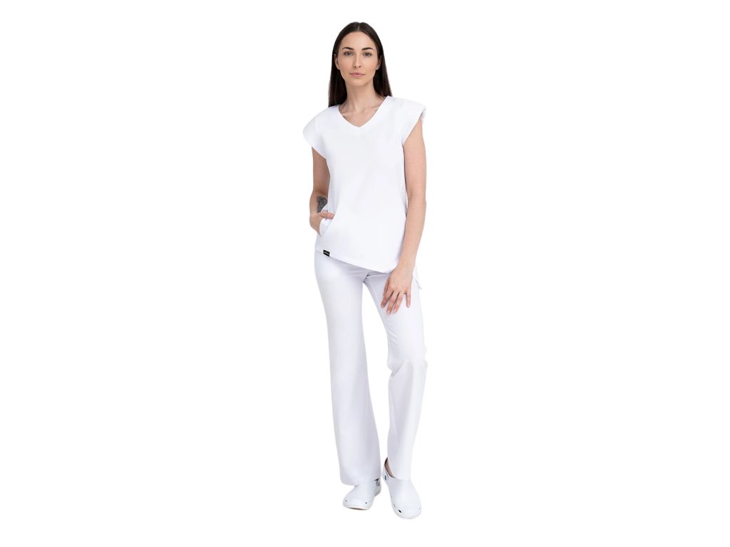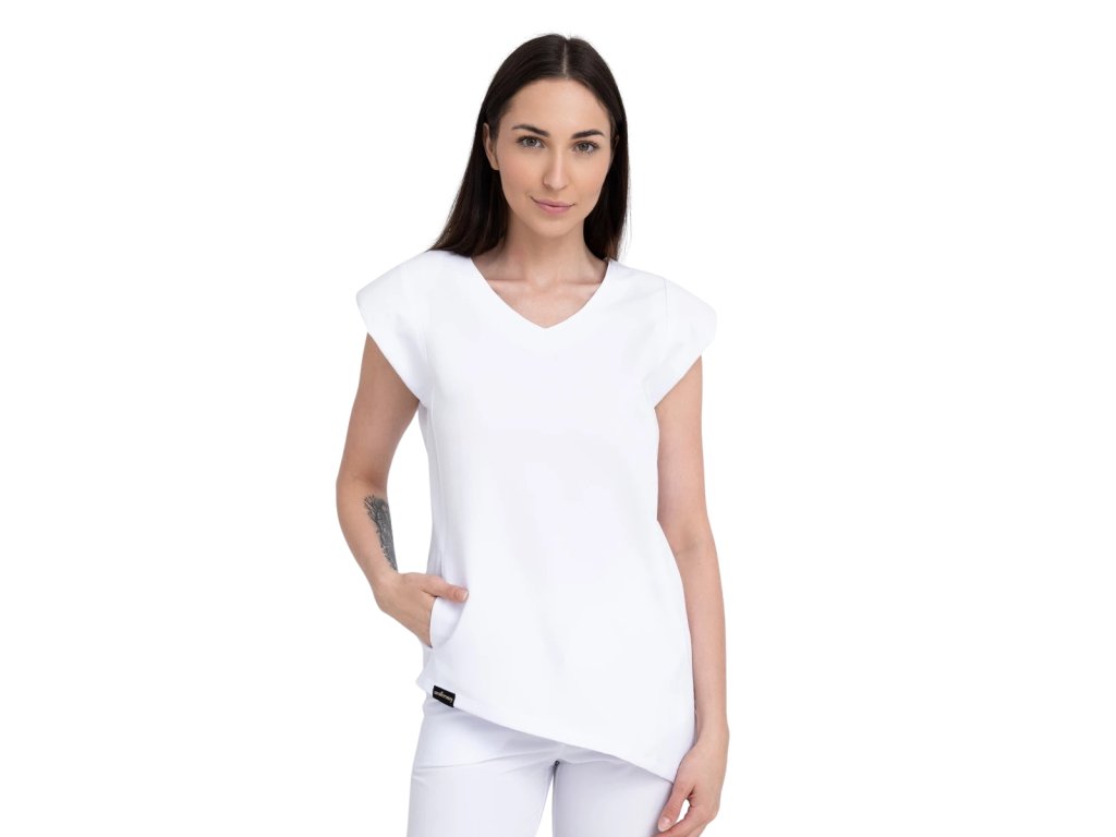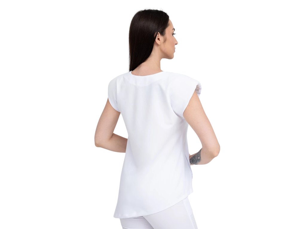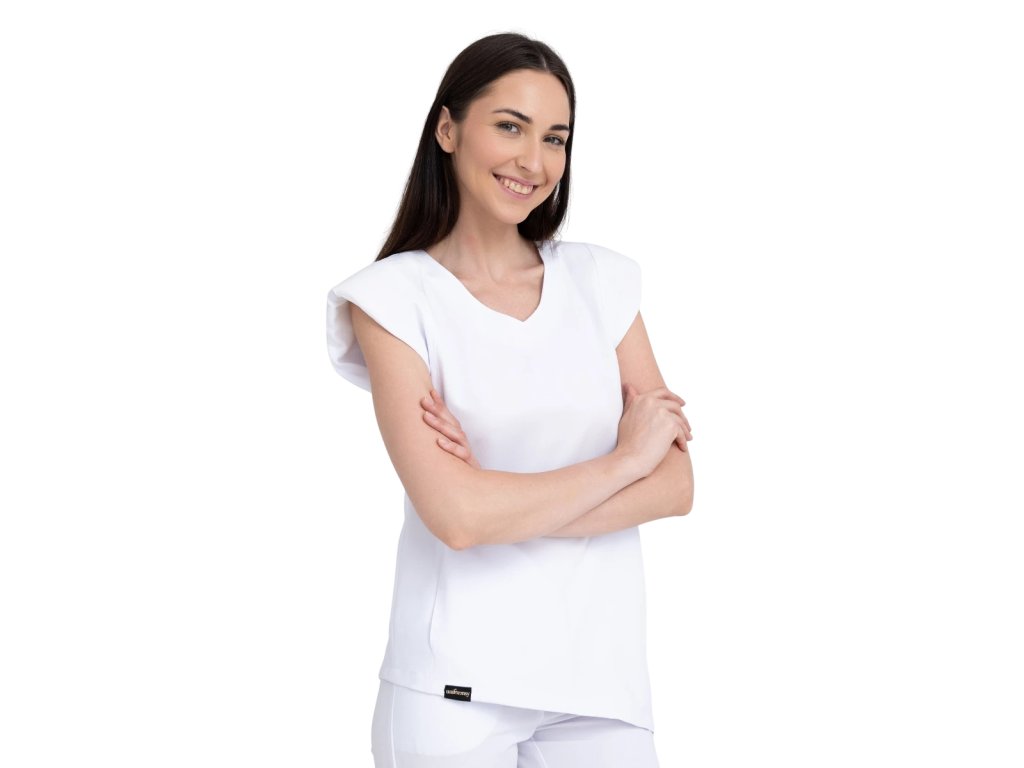 Model vyniká výstrihom do V, ktorý opticky zoštíhľuje postavu a dodáva celému outfitu ľahkosť. Krátke rukávy s mierne spustenou líniou ramien zaisťujú pohodlné nosenie a voľnejší strih neobmedzuje v pohybe – ani počas náročného dňa v kozmetickom salóne, klinike estetickej medicíny alebo v nemocnici.