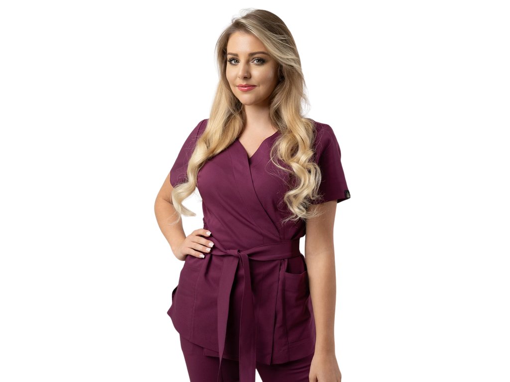 Kozmetická tunika v zavinovacom štýle je jedinečný model, ktorý v sebe spája klasický dizajn a individuálne prispôsobenie potrebám každej ženy.