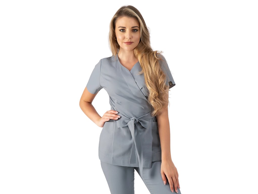 Kozmetická tunika v zavinovacom štýle je jedinečný model, ktorý v sebe spája klasický dizajn a individuálne prispôsobenie potrebám každej ženy.
