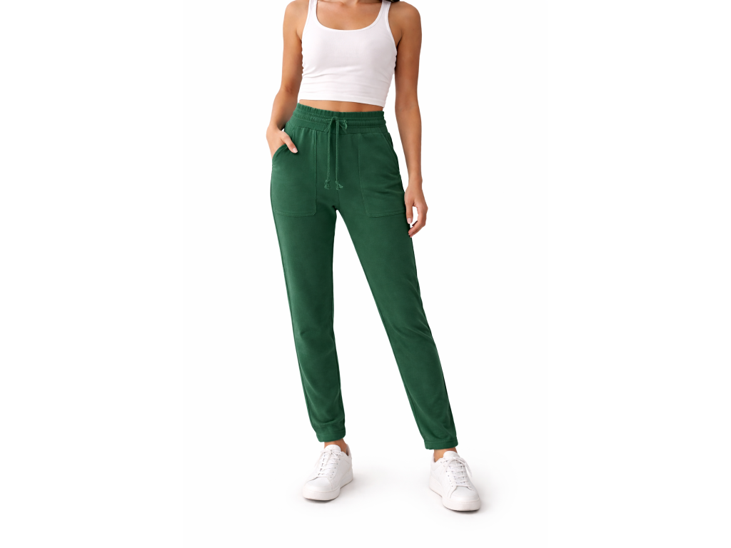 Moderné dámske tepláky v krásnej zelenej farbe sú ideálnou voľbou na každý deň. Majú pohodlný elastický pás so šnúrkou na stiahnutie, praktické predné vrecká a rovný, mierne zúžený strih na spodku bez gumičky, ktorý pôsobí elegantne a zároveň ležérne.
