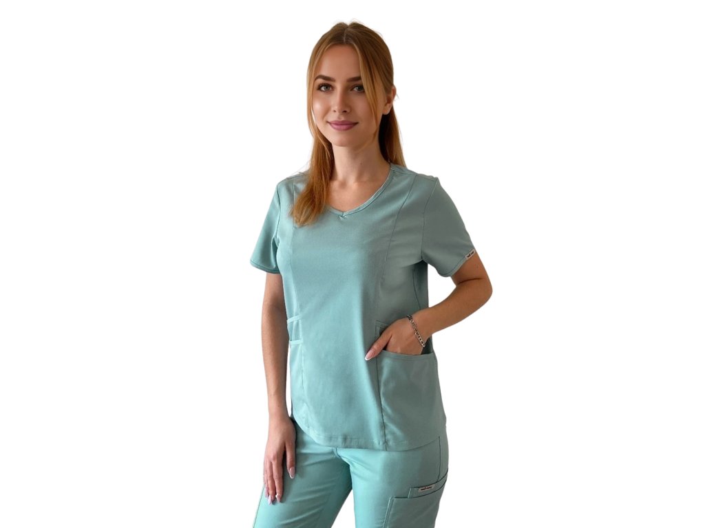 Blúzka je navrhnutá s dôrazom na každý detail. Má elegantný výstrih v tvare lodičky, ktorý zvýrazňuje ženskú siluetu, a zároveň je praktický a pohodlný na nosenie. Priliehavý strih dodáva blúzke ľahkosť a profesionálny vzhľad. Štyri praktické vrecká na prednej strane umožňujú mať po ruke najnutnejšie drobnosti, ako je telefón, pero alebo drobné lekárske pomôcky. Celok dopĺňajú starostlivo prepracované švy, ktoré zaručujú trvácnosť a elegantný vzhľad aj pri intenzívnom používaní.