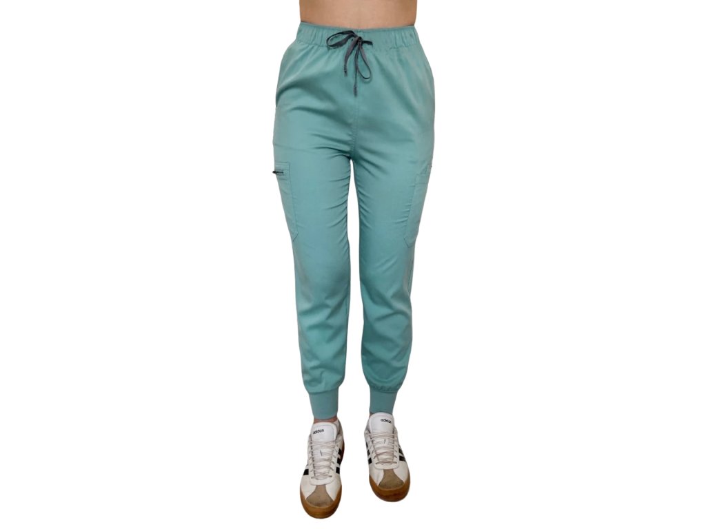 Lekárske nohavice z kompletu sú spojením športovej voľnosti a ženského štýlu. Majú stredný pás a sťahovaciu šnúrku, čo umožňuje prispôsobiť ich rôznym postavám a zaisťuje pohodlie počas celého pracovného dňa. Nohavice sú mierne zúžené a zakončené praktickým elastickým lemom, vďaka čomu perfektne sedia, neobmedzujú pohyb a pôsobia veľmi moderne. Ďalšou výhodou sú vrecká na oboch nohaviciach, ktoré poskytujú rýchly prístup k potrebným veciam. Toto riešenie ocenia najmä ľudia pracujúci v rýchlom tempe, kde záleží na pohodlí a funkčnosti.