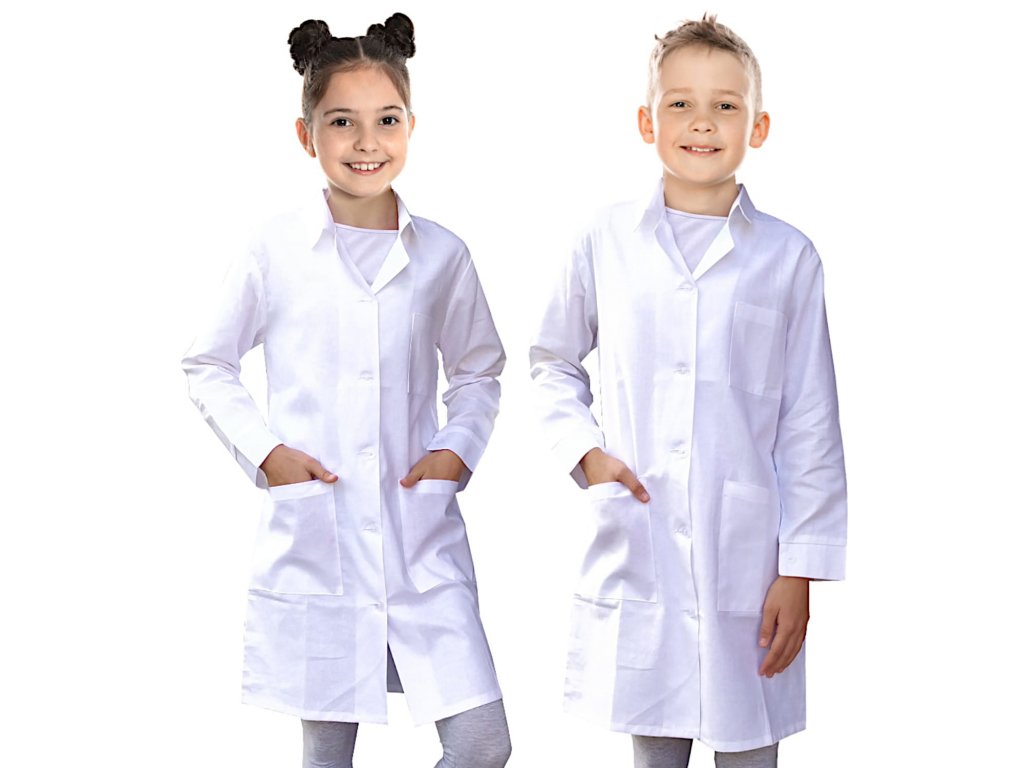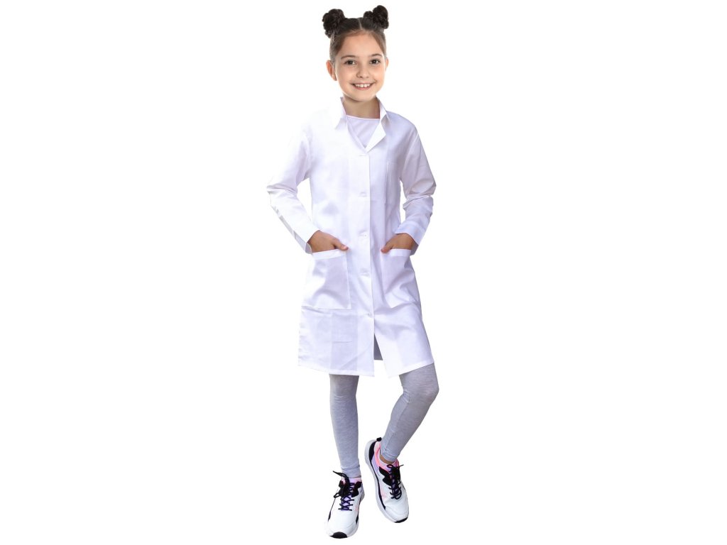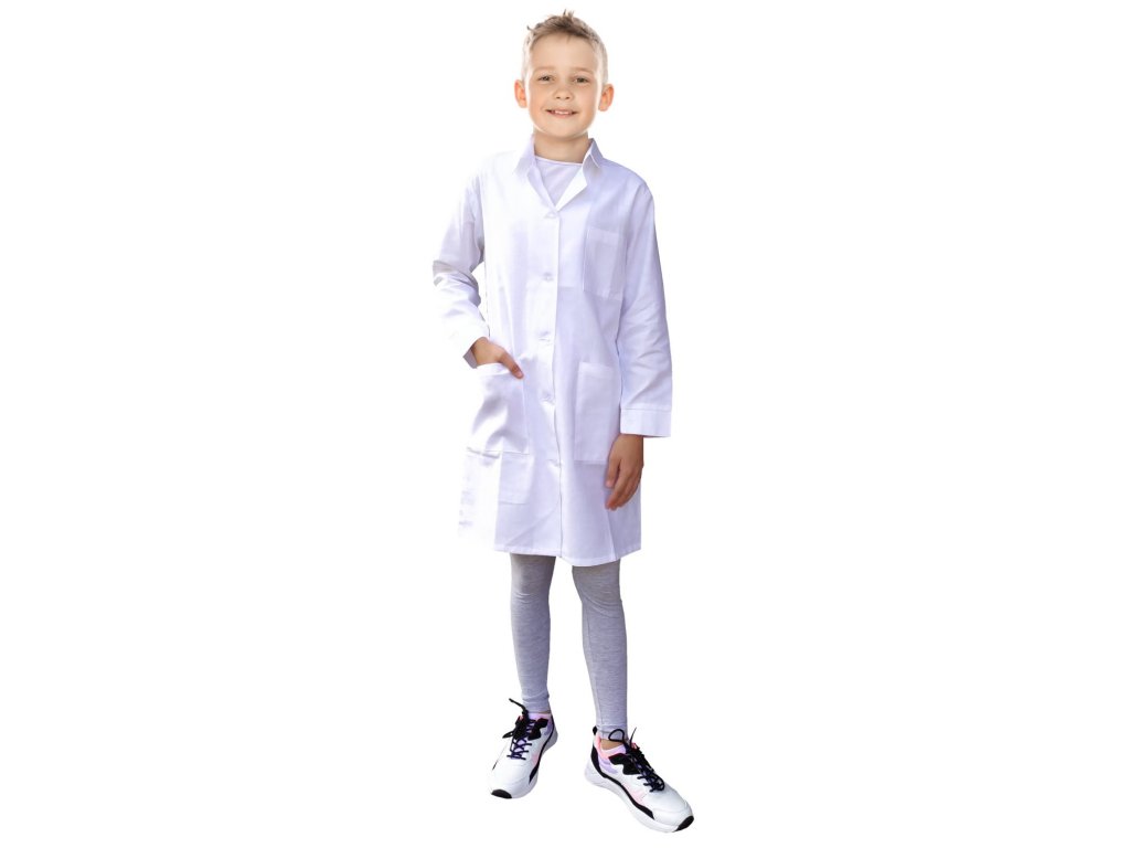 Klasický biely zdravotnícky plášť zo 100 % bavlny určený pre deti. Zástera nájde uplatnenie na maškarných plesoch, v laboratórnych triedach v škole a v materskej škole. Môže slúžiť aj ako ochrana pri didaktických prácach.