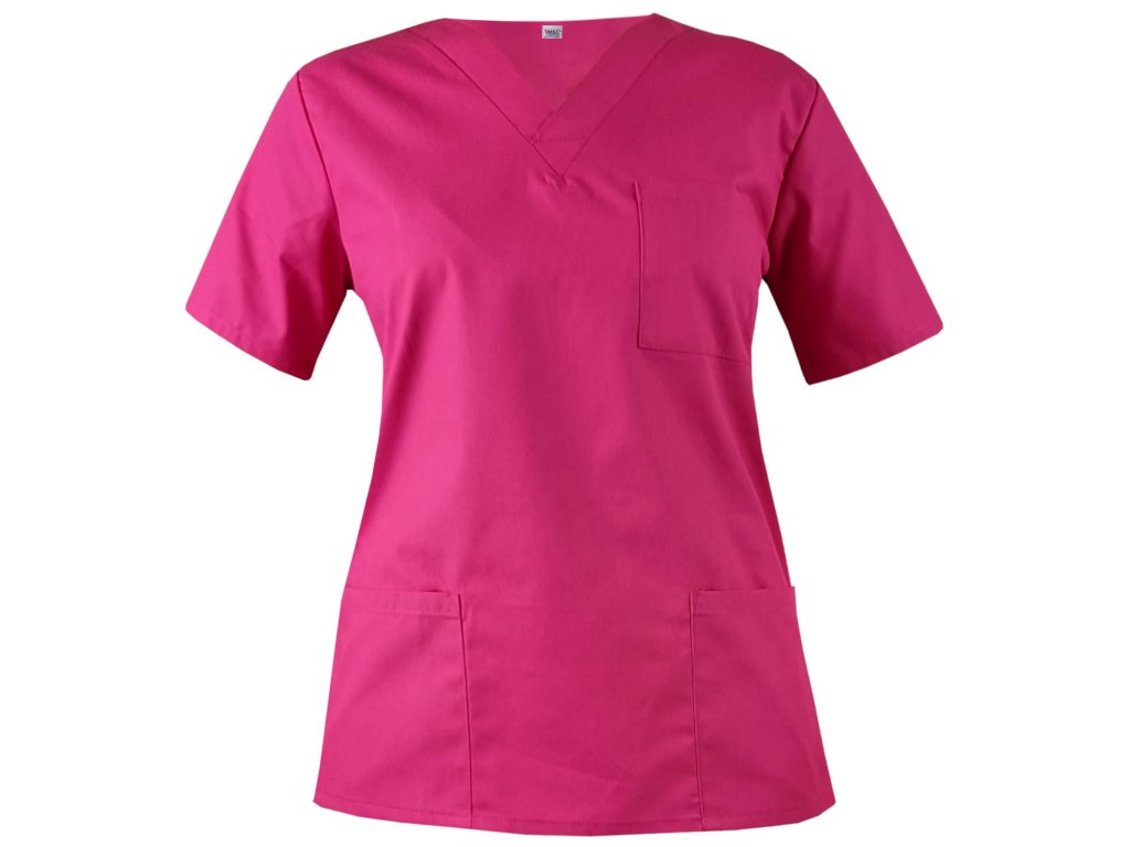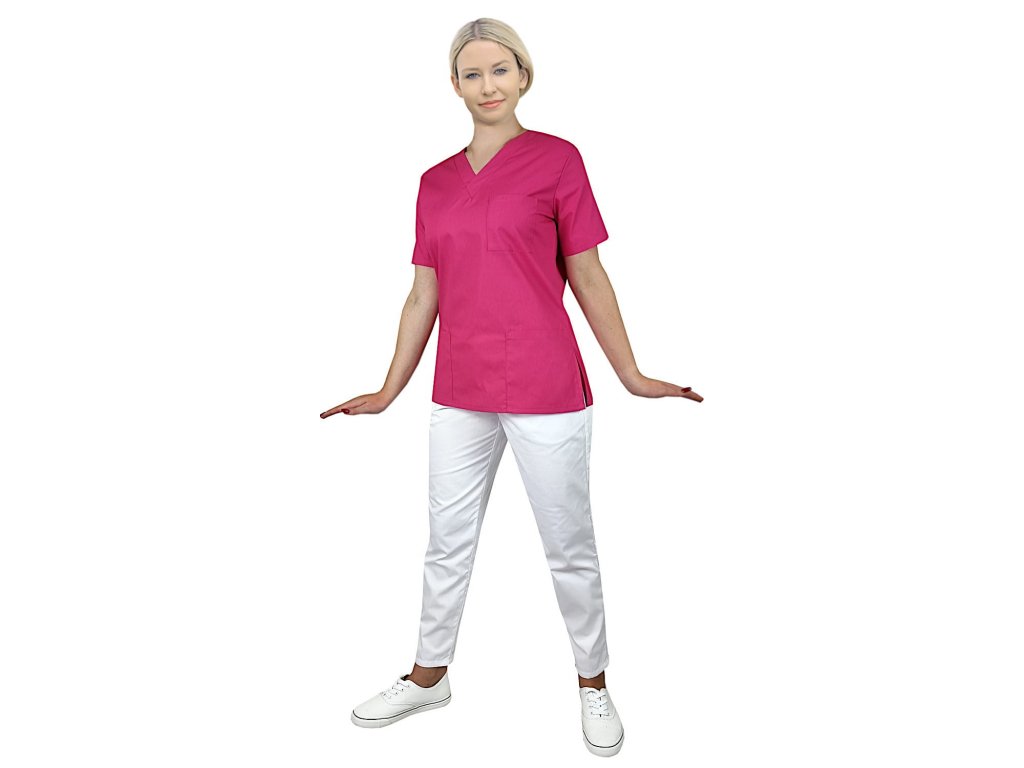 BLÚZKA -krátke rukávy -V-výstrih -dve všité vrecká vo výške bokov a jedno na ľavej strane hrudníka -strih na mieru (zdôrazňuje líniu pásu) -materiál: bavlna 50%, polyester 50% -gramáž: 185g / m2