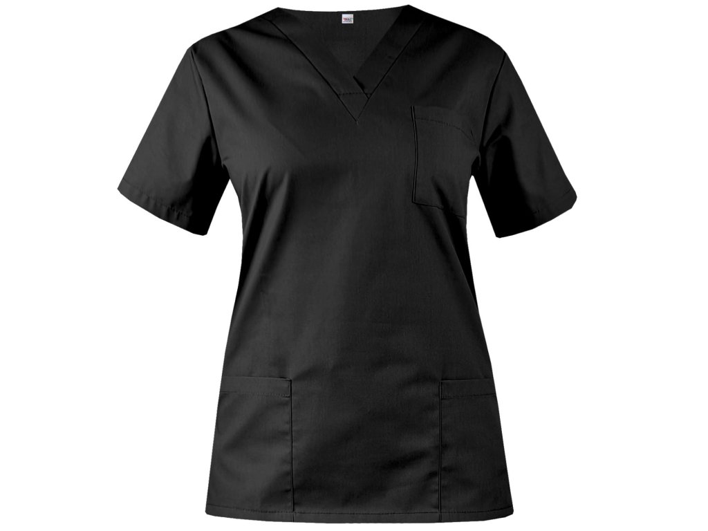 BLÚZKA -krátke rukávy -V-výstrih -dve všité vrecká vo výške bokov a jedno na ľavej strane hrudníka -strih na mieru (zdôrazňuje líniu pásu) -materiál: bavlna 50%, polyester 50% -gramáž: 185g / m2