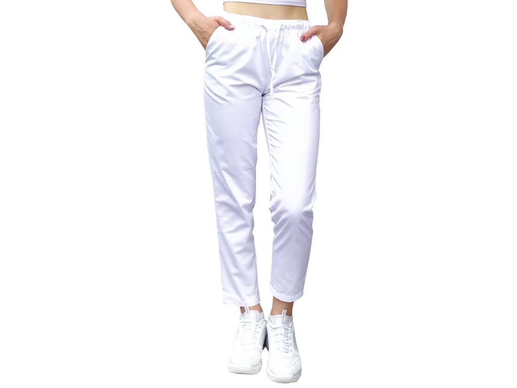 Štýlové dámske lekárske nohavice cigaretového typu s jednoduchým a pohodlným strihom - ideálne pre ženy, ktoré majú radi klasický štýl. Pás je ukončený gumou so sťahovacou šnúrkou, ktorá zaručuje skvelý komfort pri nosení a veľkú možnosť nastavenia veľkosti. Model má navyše dve diskrétne zapustené vrecká vpredu a rovný a zúžený strih , ktorý zodpovedá aktuálnym módnym trendom. Nohavice sú vyrobené z vysoko kvalitnej textílie, vďaka ktorej sa mimoriadne ľahko čistí. Materiál je ľahký, nepriehľadný, stálofarebný a ľahko sa žehlí.
