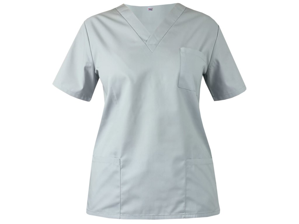 BLÚZKA -krátke rukávy -V-výstrih -dve všité vrecká vo výške bokov a jedno na ľavej strane hrudníka -strih na mieru (zdôrazňuje líniu pásu) -materiál: bavlna 50%, polyester 50% -gramáž: 185g / m2